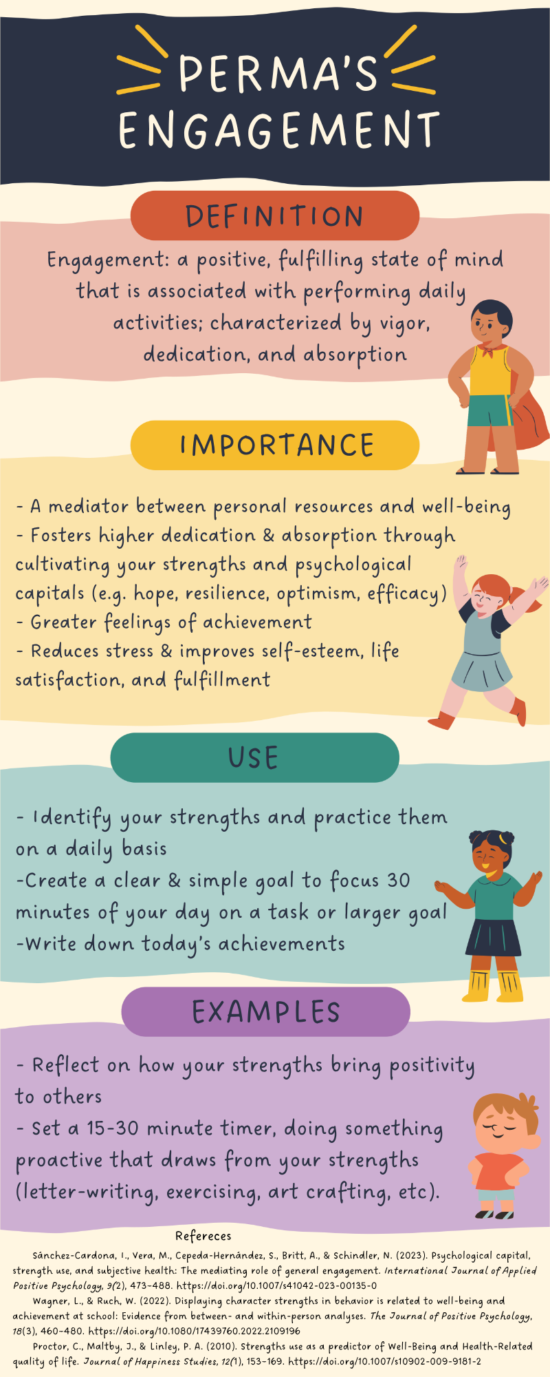 The second letter in the PERMA model (Seligman, 2012) is E, for “Engagement.” This aspect of PERMA includes the concept of “Flow,” and the two terms are often used in conjunction to describe this element. See the infographics below on engagement/flow and how to achieve this state through daily activities!