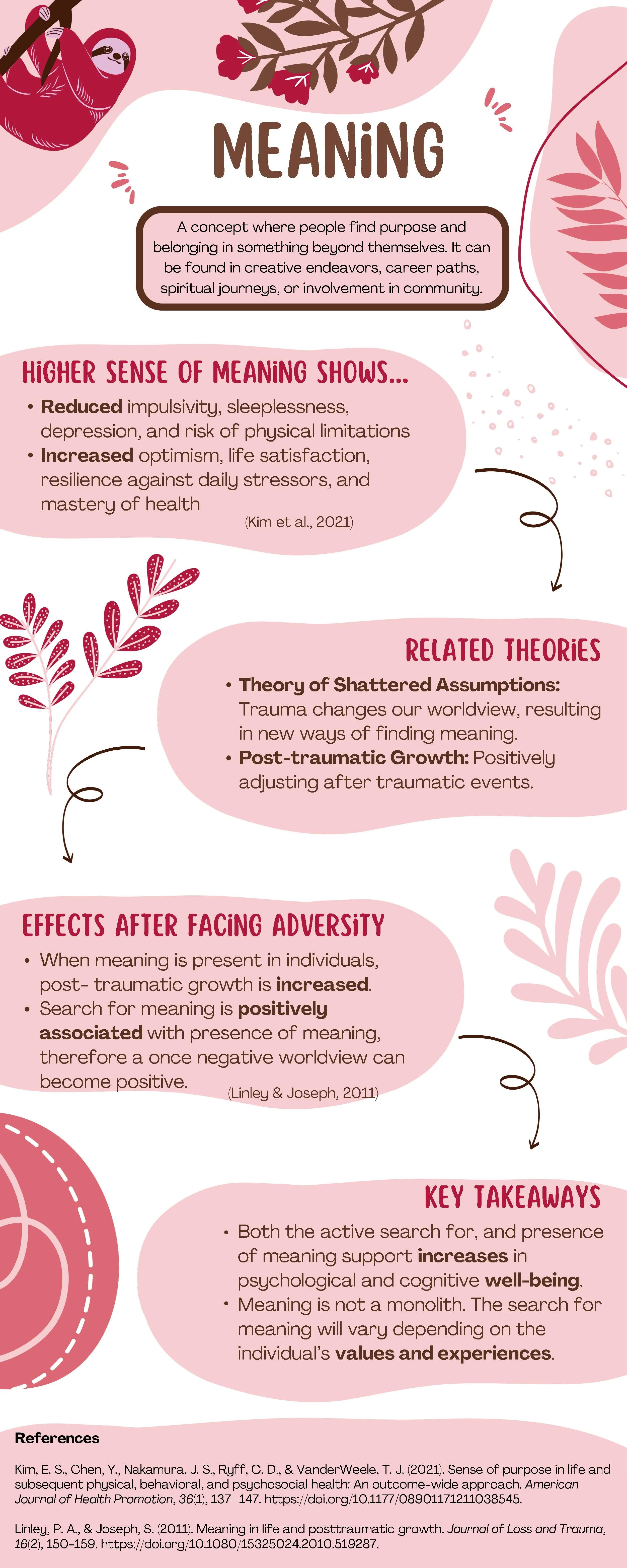 A key take away about the power of meaning is its ability to foster resilience. Those who are able to find meaning in the challenges they face are better able to take a positive approach to adversity, and increase the chance that they will experience growth following a traumatic event, rather than feeling trapped in the trauma itself.