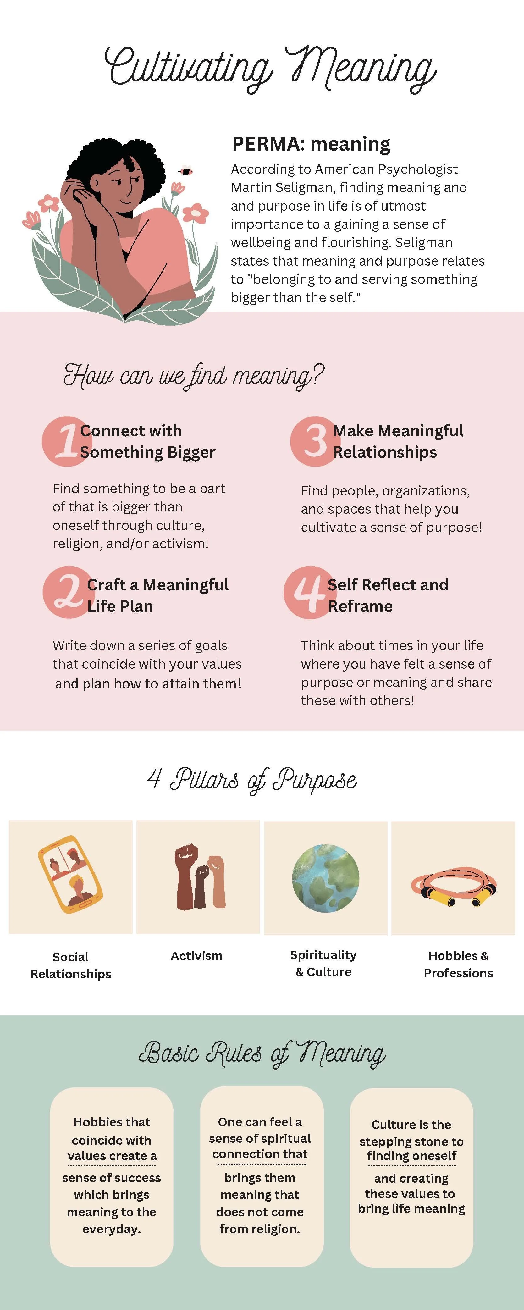 A sense of meaning is different for everyone however, and can be pursued through professions, social or political causes that one is passionate about, a creative hobby, or through spiritual/religious beliefs and practices. Meaning is guided by personal values; discovering what is important and following those passions.